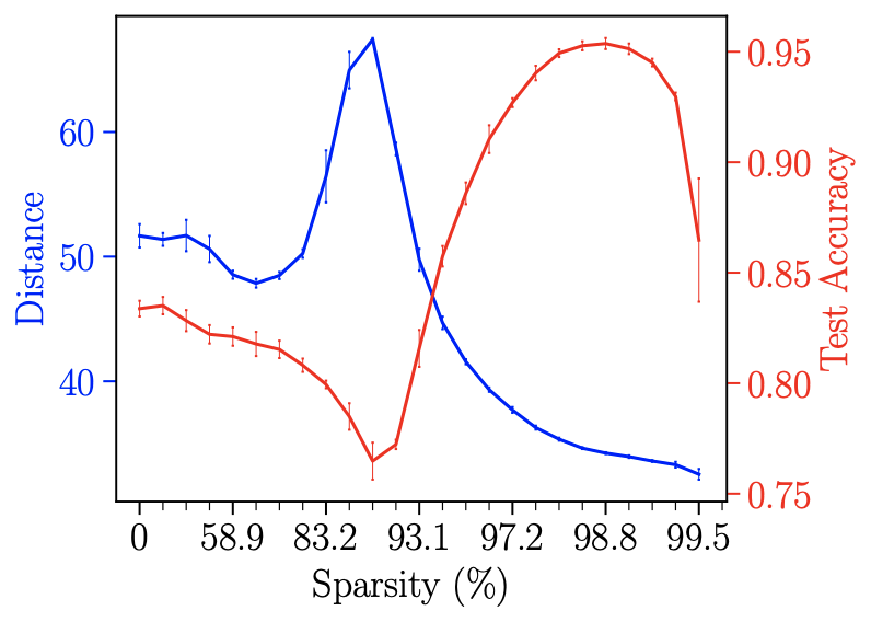 As can be seen from the figure, when the accuracy rate decreases, the overall learning distance tends to increase, and the highest point corresponds to the lowest point of the accuracy rate; when the accuracy rate increases, the learning distance also decreases accordingly. The change in learning distance is generally in line with the trend of sparse double descent (although when the test accuracy declines for the second time, it is difficult for the learning distance to rise again due to too few trainable parameters).