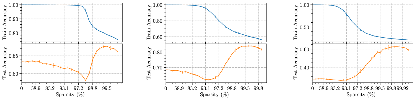 Experiments revealed that the “redundant” parameters in the network are not completely redundant. When increasing model sparsity through iterative pruning, even if the model training accuracy has not been affected, its test accuracy may decline significantly, where the model overfits noise. If the sparsity of the model is further increased, it can be found that after passing the interpolation threshold, the training accuracy of the model begins to drop rapidly, and the test accuracy begins to increase, and the robustness of the model to noise is gradually improved. If you continue to reduce the parameters of the model after the test accuracy rate reaches its highest point, the training and testing accuracy of the model decreases at the same time, where the model gradually loses its learning ability.