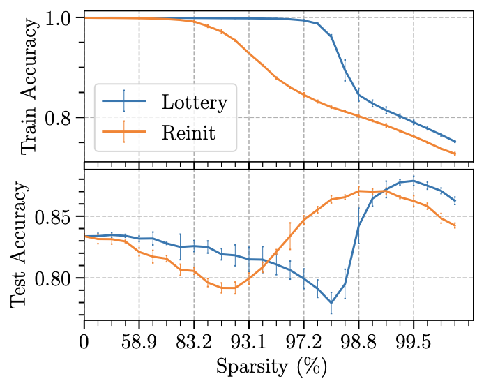 It can be seen from the figure that the result of Reinit is shifted to the left compared to Lottery as a whole, that is to say, the Reinit method is inferior to Lottery in terms of retaining the expressive ability of the model. This also validates the lottery ticket hypothesis: even if the structure of the model is the same, the performance of the model may be very different when trained from different initializations.