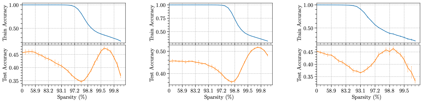 Here I share our new work on network pruning “Sparse Double Descent: Where Network Pruning Aggravates Overfitting”. This work was mainly inspired by recent studies on model over-parameterization and lottery tickets hypothesis, where we explored and analyzed the generalization performance of sparse neural networks. Main conclusion: The double descent phenomenon exists in sparse neural networks-as sparsity increases, the test accuracy of the model will first decrease, then increase, and finally decrease again.